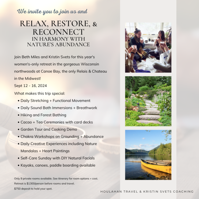Imagine this.... you are driving into the beautiful secluded Canoe Bay resort in the Northwoods of Wisconsin, where the lush landscapes immediately provide a sense of calm. You have three full days in front of you, gathering with other women to take a deeply restorative pause, feeling the weight of your stress and worries start to melt away. With the perfect balance of movement, rest, workshops, creativity, nourishing food, a Self Care Sunday DIY facial, and plenty of time for solitude, hiking in the woods or indulging in long, slow walks, paddle boarding, and just reading a book, this immersion truly fills your cup. You leave the long weekend feeling rejuvenated in your mind, body, + soul.